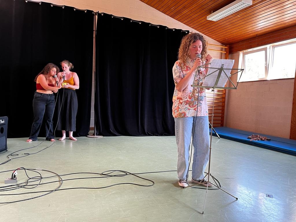 Groepsopwarmingsoefeningen, zang-, ritmische en fysieke oefeningen en schrijfspelletjes.