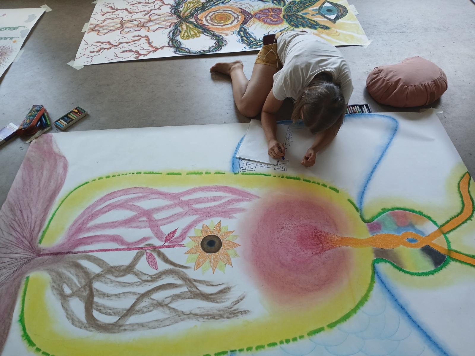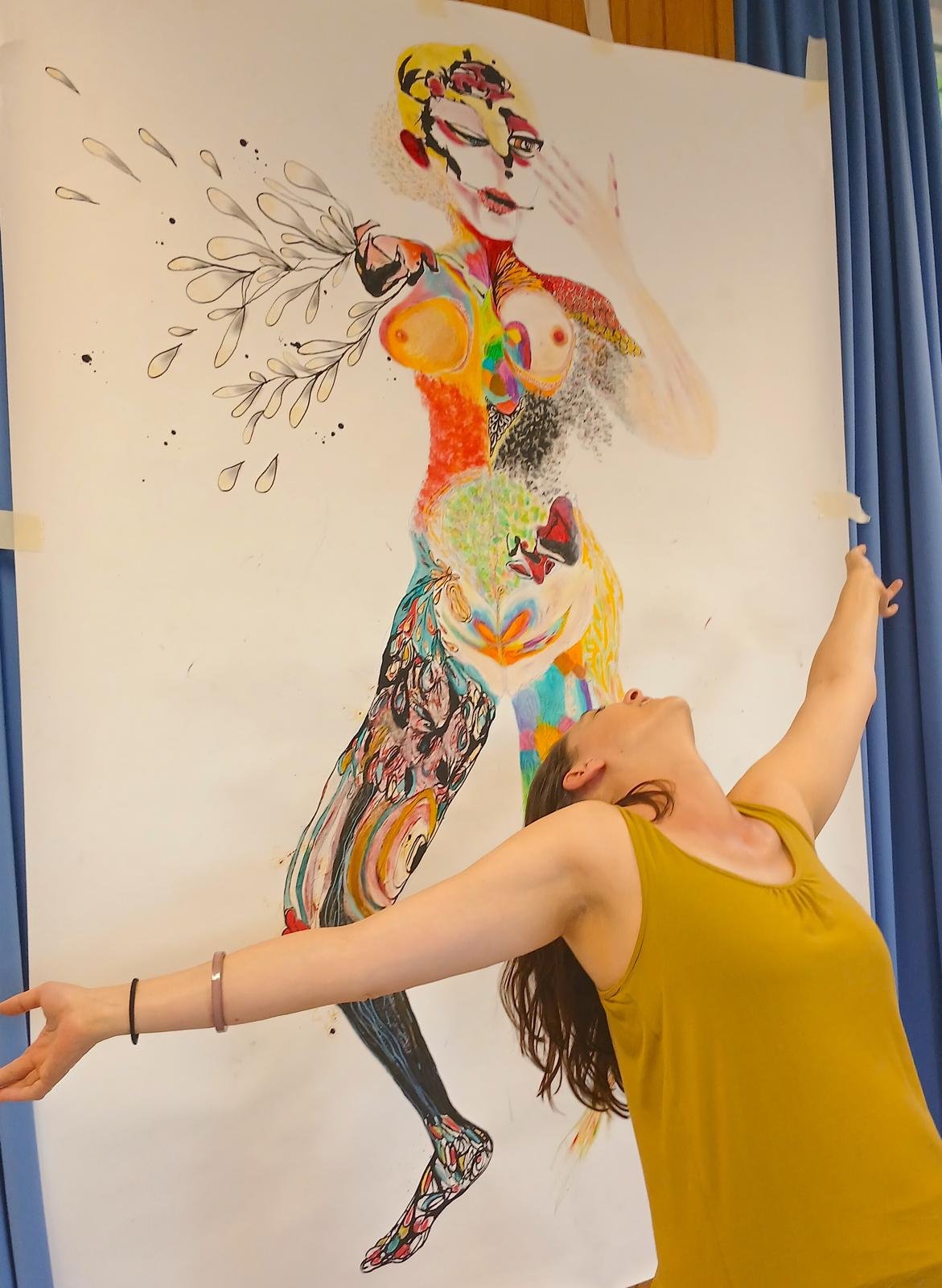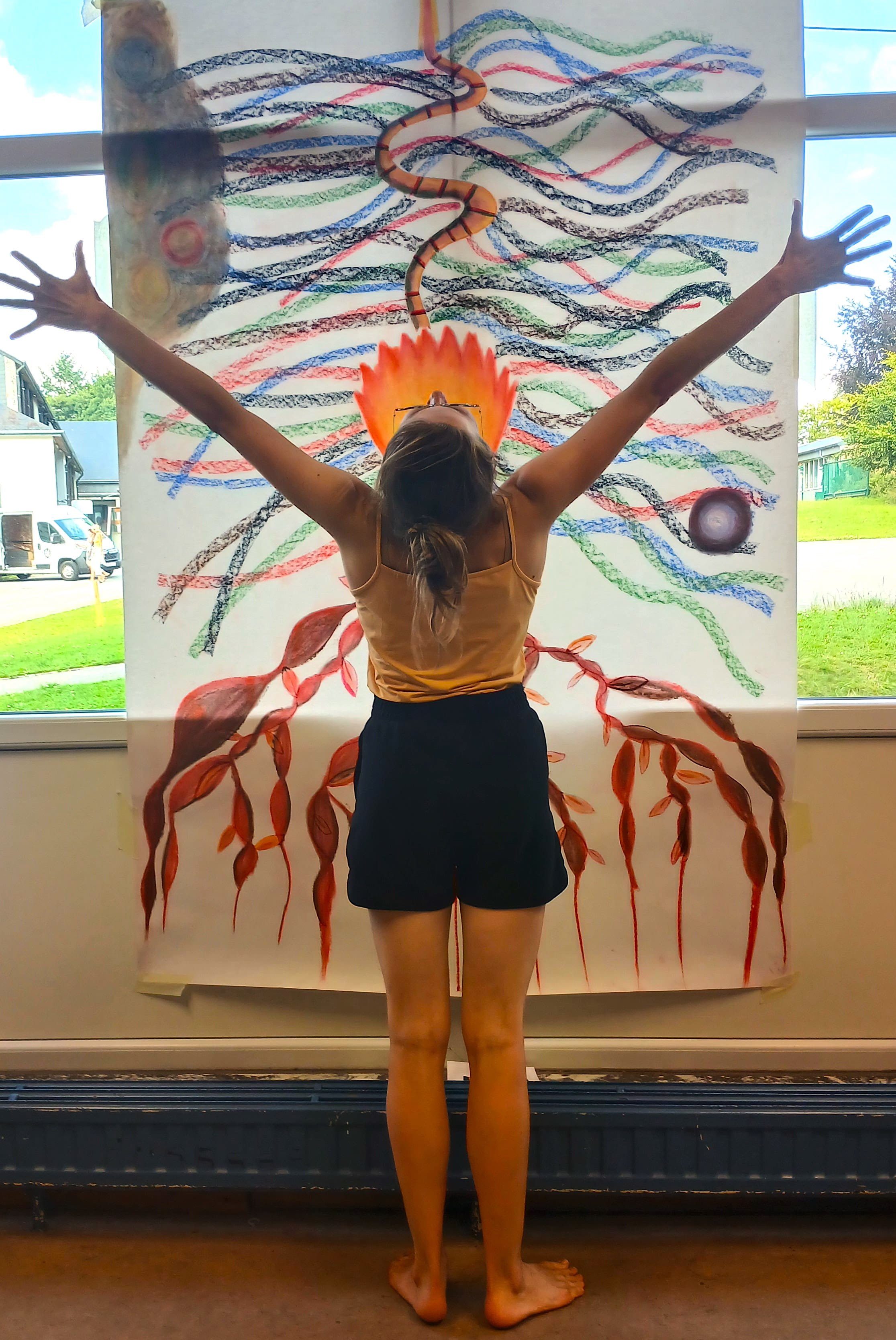 Deze praktijk is intermodaal en verkent spontane dans, beweging, spel, tekenen, zingen en schrijven.