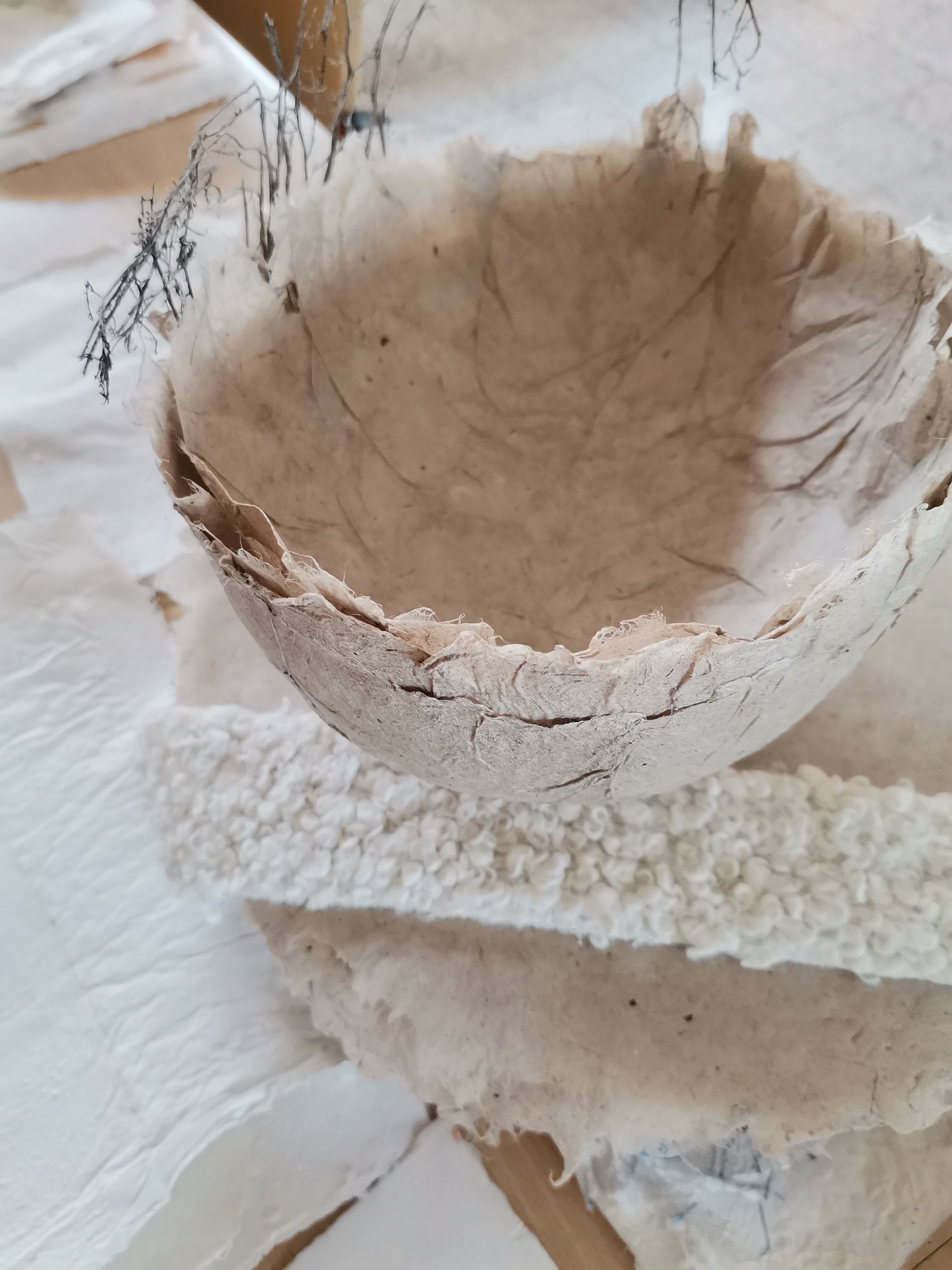 Naarmate de dagen vorderen, zullen we ons geleidelijk aan verdiepen in onderzoek en creatie rond kleur, reliëf, materiaal, transparantie, volume en compositie. We zullen samen de variaties observeren die verband houden met de manier waarop het vel wordt gevormd of gedroogd.